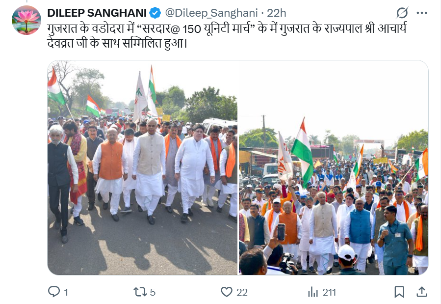 वडोदरा में आयोजित इस मार्च ने भी इसी भावना को प्रतिबिंबित किया, जिसमें सहकारी क्षेत्र और आम जनता की व्यापक भागीदारी देखने को मिली। दिलीप सांघाणी की उपस्थिति ने कार्यक्रम को और भी महत्व प्रदान किया, जिसने एकता, सद्भाव और सामूहिक प्रगति के संदेश को मजबूत किया।