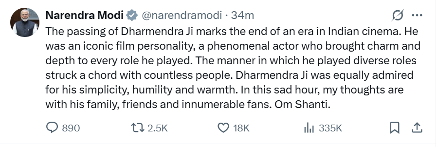इस खबर के मिलते ही प्रधानमंत्री मोदी ने अपने एक्स हेंडल पर शोक व्यक्त किया। उन्होंने लिखा ,”धर्मेंद्र जी के जाने से इंडियन सिनेमा में एक युग का अंत हो गया है। वह एक आइकॉनिक फिल्म पर्सनैलिटी थे, एक जबरदस्त एक्टर थे जो अपने हर रोल में चार्म और गहराई लाते थे। जिस तरह से उन्होंने अलग-अलग रोल किए, उसने अनगिनत लोगों के दिलों को छुआ। धर्मेंद्र जी अपनी सादगी, विनम्रता और प्यार के लिए भी उतने ही जाने जाते थे। इस दुख की घड़ी में, मेरी दुआएं उनके परिवार, दोस्तों और अनगिनत फैंस के साथ हैं।”